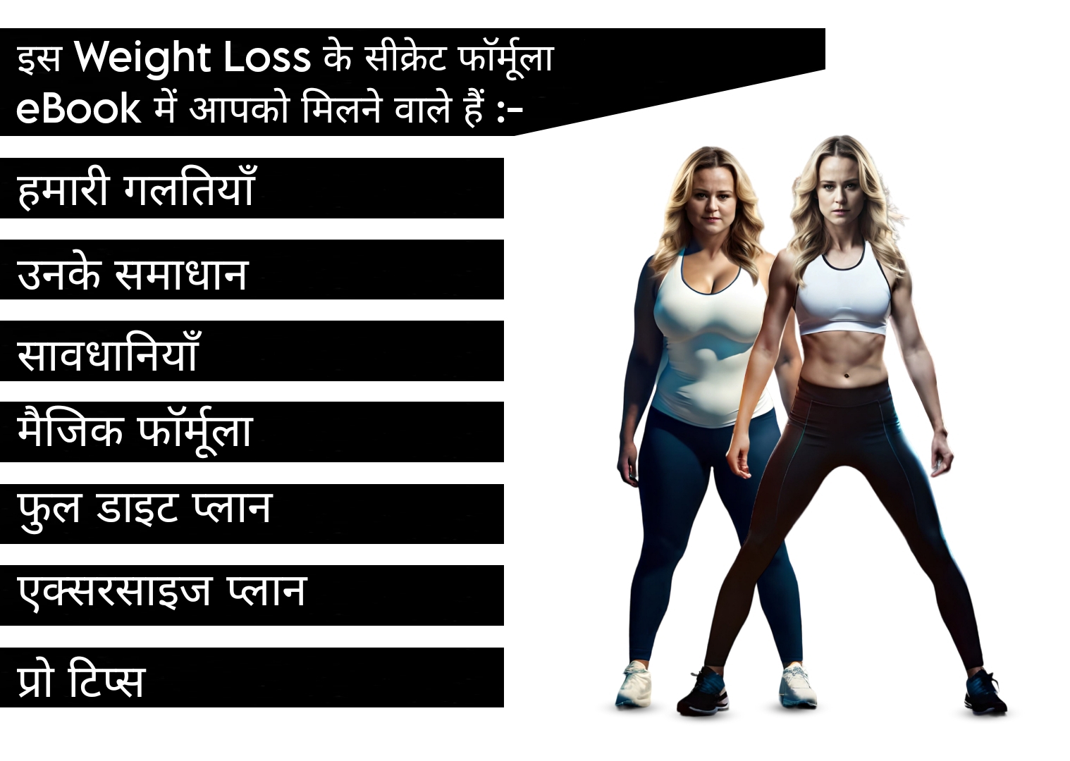 पर हमारे "Weight Loss Kit ” में आपको अपने द्वारा किये जा रहे गलतियों का सही से पता चल सकेगा, इसके बाद आपको इस Kit में "Secret Formula eBook/Weight Loss Training Video File मिलने वाला है, साथ ही आपको इस Kit में कुछ समय के लिए नहीं बल्कि ज़िन्दगी भर फिट रहने का मंत्र भी मिलने वाला है, तो एक फिट ज़िन्दगी को जानने और उसे खुद पर लागु कर एक सुडोल शरीर पाने के लिए आज ही हमारे “वेट लॉस किट" (कम्पलीट पैकेज) को प्राप्त करें |